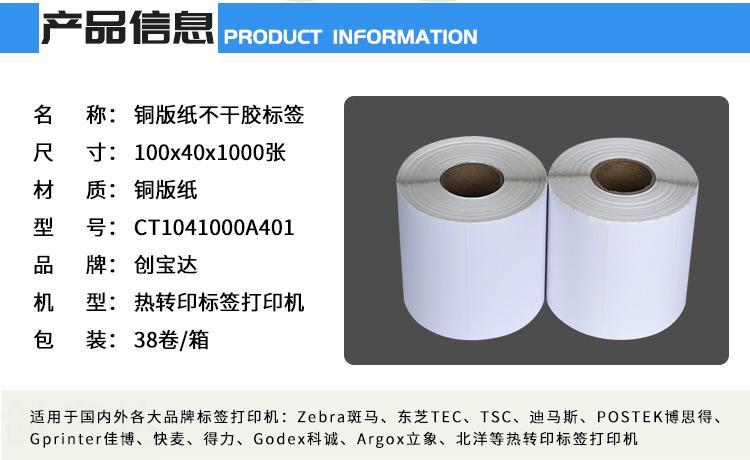 適合不同氣候地區(qū)使用,適用電子電器、五金塑膠、服裝、醫(yī)藥、日化、食品、商超、倉儲(chǔ)物流、資產(chǎn)管理、條碼標(biāo)識(shí)、外箱貼紙等長(zhǎng)期保存的產(chǎn)品標(biāo)簽及外箱標(biāo)簽同時(shí)也可以用于長(zhǎng)時(shí)間保存(配合碳帶)的亞馬遜、郵政國際、物流標(biāo)簽、郵政包裹、EBAY、速賣通、遞四方、出口EUB標(biāo)簽、出口電商等標(biāo)簽