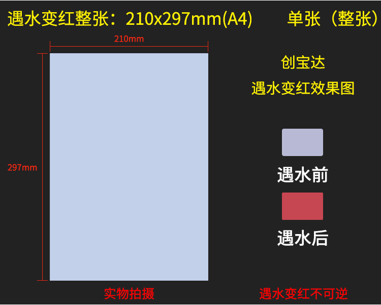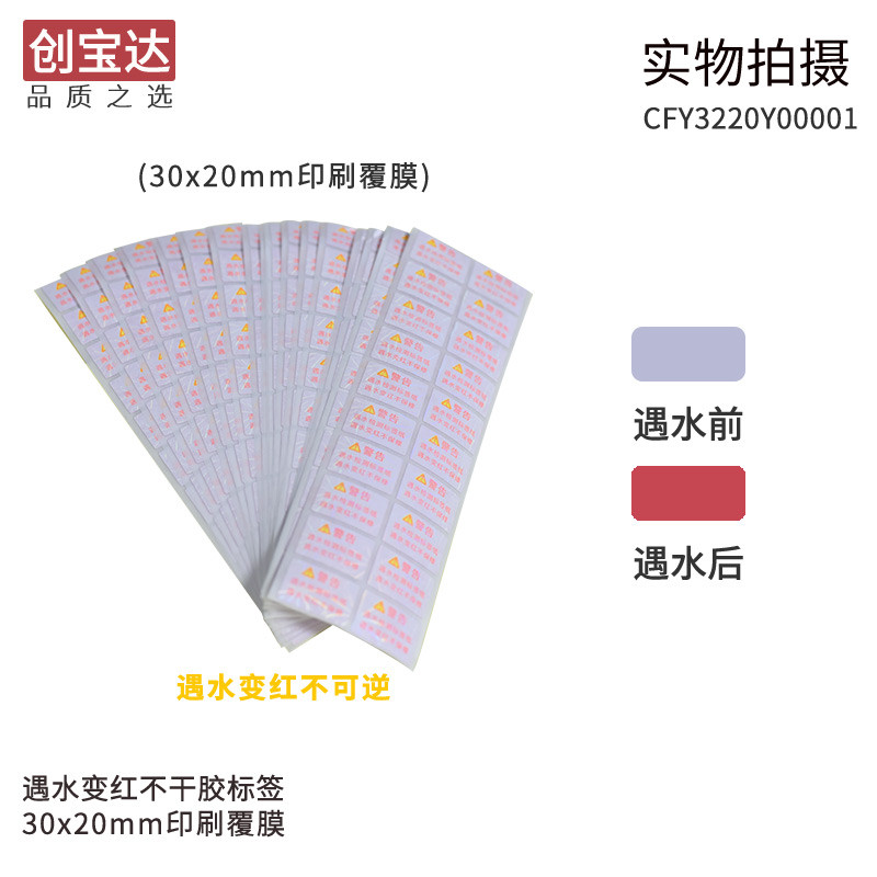 遇水變色標(biāo)簽,也稱水感標(biāo)簽。此標(biāo)簽完全遇水時(shí)將會(huì)變紅色,顏色不可逆轉(zhuǎn)。是針對目前維修服務(wù)對手機(jī)、電池、電子、電器、LCD等產(chǎn)品遇水損壞后難以識(shí)別或錯(cuò)誤識(shí)別、控制不符合條件的保修,同時(shí)也是為遠(yuǎn)洋運(yùn)輸貨物進(jìn)水鑒別、為索賠提供合法依據(jù)而開發(fā)出來的一種新型產(chǎn)品。